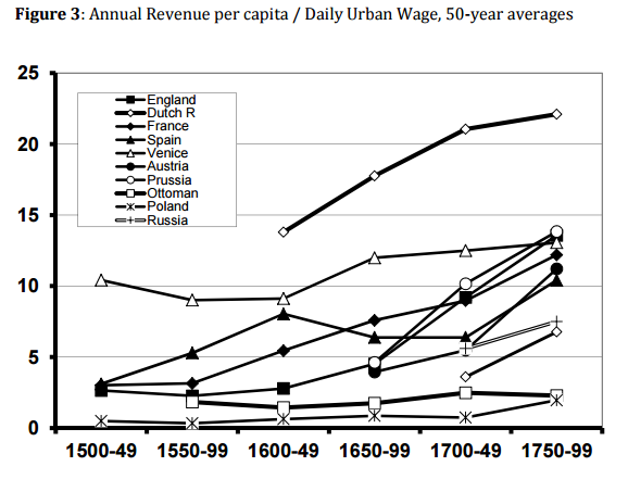 …During the first half of the sixteenth century, annual tax revenues per capita did not exceed 5 days of unskilled urban wages in most European countries. The only exceptions were the small and highly urbanized entities such as Venice and Holland. By the end of the eighteenth century, however, …many others had reached the 10 to 15 daily wages range and annual per capita revenues of the central administration in the Dutch Republic exceeded 20 days of urban wages. It is worth noting that the middle group where annual per capita revenues reached 10 to 15 daily wages included not only the more urbanized western European countries such as England, France, Spain and Venice but also the more rural and agricultural countries in central and eastern Europe such as Austria.”