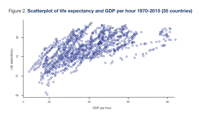 Based on our analysis of OECD data we find life expectancy is positively associated with productivity. As life expectancy rises, this leads to increased output per hour worked, per worker and per capita.