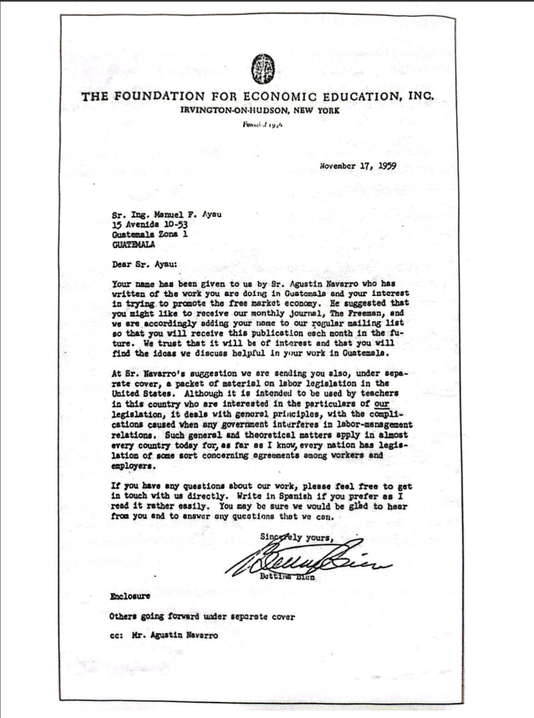 The same week, Bettina Bien Greaves, from the Foundation for Economic Education, wrote from New York, offering support, resources, and encouragement to Ayau. This letter marked the beginning of a lasting partnership between Ayau’s group and FEE. What began as a simple exchange of ideas grew into a profound and enduring collaboration, shaping their vision and laying the intellectual foundation for advancing liberty in Guatemala.