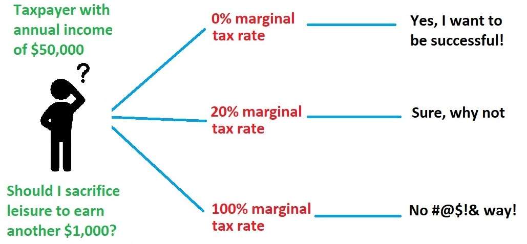 But I also included an example that’s more relevant to the rest of us, looking at our aforementioned hypothetical taxpayer with a 20 percent average tax rate on annual earnings of $50,000. I asked about incentives for this taxpayer to earn more money if the marginal tax rate on additional income was 0 percent, 20 percent, or 100 percent.