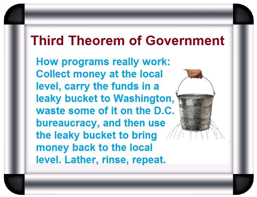 But there’s also a common-sense argument against federal involvement. And that gives me an excuse to introduce my Third Theorem of Government. Simply stated, it’s a recipe for waste to launder money through Washington.