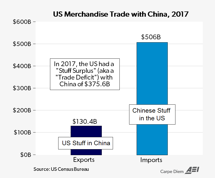 It’s an important point to realize that if you think about America’s “trade deficit” and look carefully at “who, on net, ends up with the most stuff (goods)” you’d conclude that what is typically and pejoratively called a “trade deficit” by Trump and others is actually a “stuff surplus.” That is, if you look at who ends up with the most stuff from international trade on net, America’s so-called “trade deficit” with China last year of $375 billion was actually, and perhaps more accurately, a $375 billion net inflow of goods or a “goods surplus” (see chart above). Specifically, American companies purchased $506 billion worth of merchandise from Chinese producers, and Chinese firms purchased $130.4 billion worth of goods and services from American producers, leading to a $375.6 billion “goods or merchandise surplus” (or an “in-kind surplus” according to Don and Dan’s terminology above) for the US when measured by who actually ends up with (and enjoying) the stuff.
