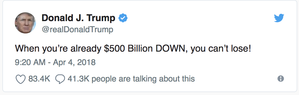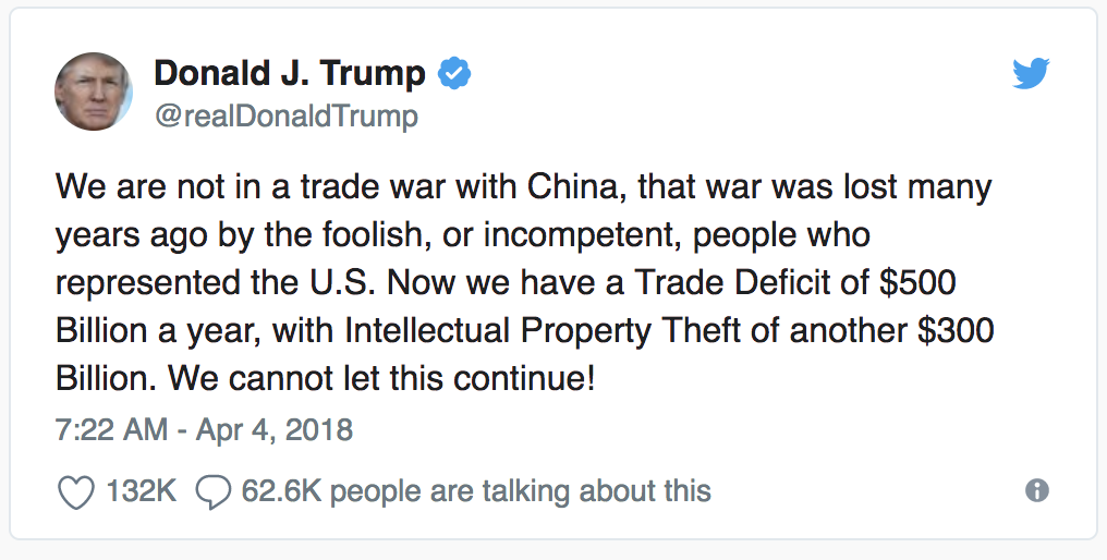 We’ve heard for years now from Donald Trump about how China has perpetrated one of the “greatest thefts in the history of the world” when it comes to trade with the U.S. His latest Tweets today (above) claim that: a)”We are not in a trade war with China, that war was lost many years ago by the foolish, or incompetent, people who represented the U.S” and b) “When you’re already $500 Billion DOWN, you can’t lose!” Once again, the “mercantilist-in-chief” demonstrates his uninformed and “upside-down” thinking about trade and trade deficits.