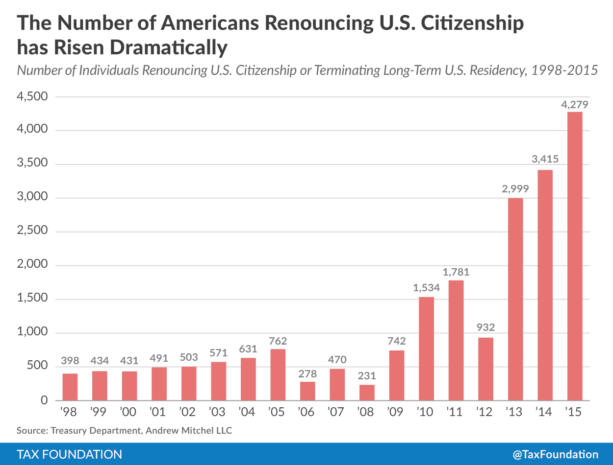 Last year, 4,279 individuals renounced their U.S. citizenship or terminated their long-term U.S. residency, according to the Treasury Department. This figure is up by 25.3 percent from 2014, when 3,415 individuals renounced their citizenship.