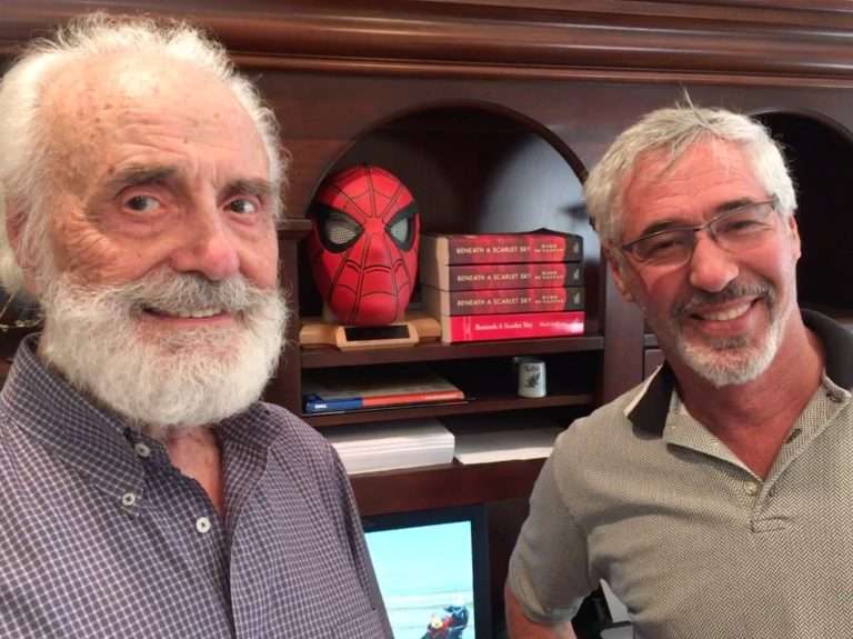 (Editor’s Note: The picture at the top of this article, of Pino Lella and his son Michael, includes a Spiderman mask next to copies of Beneath a Scarlet Sky. Just one week before my April 12, 2018, visit with Pino on Lake Maggiore (pictured below), British actor Tom Holland, the most recent Spiderman in two major motion pictures, visited with Pino to meet the man whom he will play in a forthcoming television mini-series based on the book. Filming begins soon. – LWR).