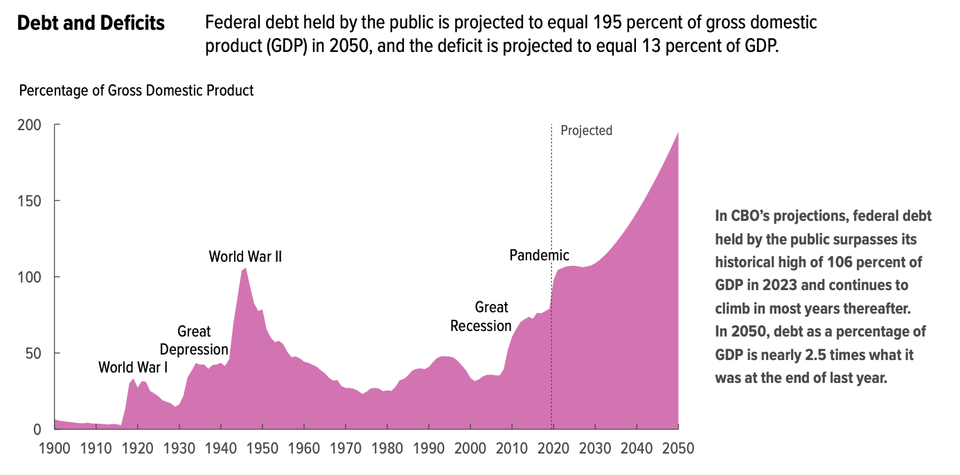 The long-term outlook is incredibly bleak. CBO finds that by 2050, the size of the national debt will be nearly double the size of our economy.