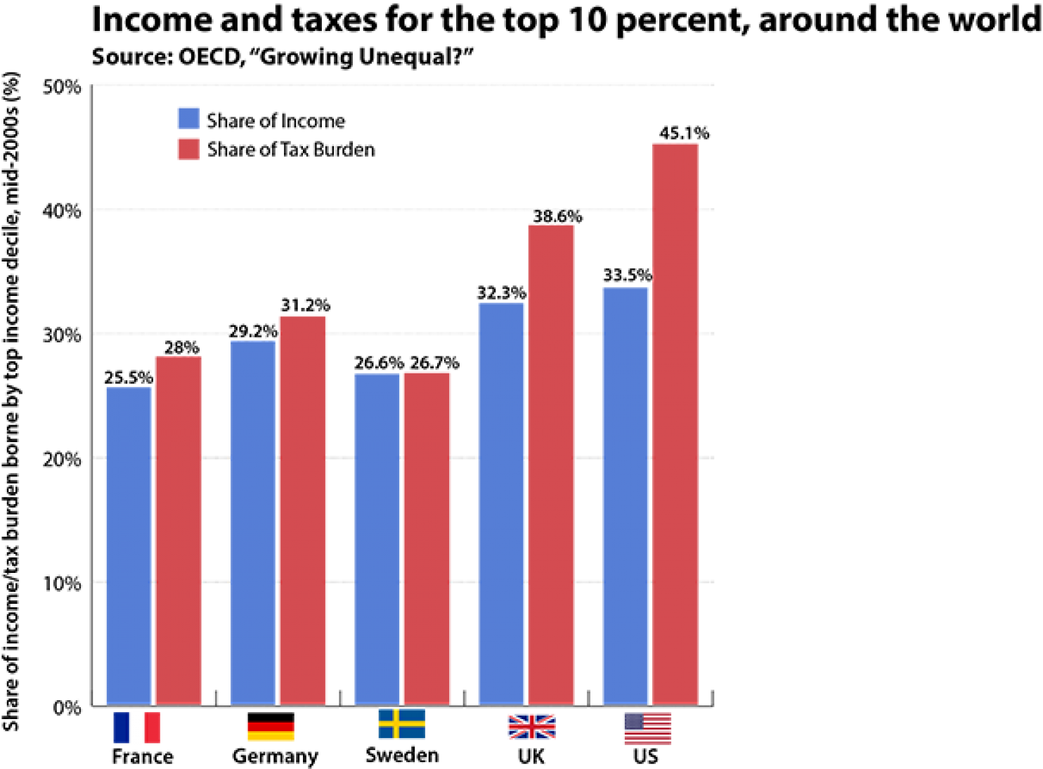 Observe that the top 10 percent of earners in the US make 33.5% of national income, yet are responsible for 45% of tax revenues; on the other hand, Sweden’s top 10 percent make 26.6% of national income, but shoulder exactly 26.6% of the tax burden. America’s ratio of 45/33.5 is the highest in the developed world, and thus our tax code is the most progressive.