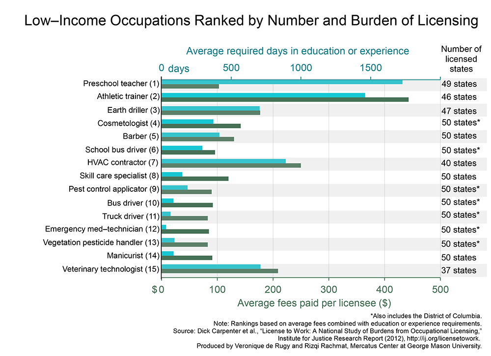 In the 1950s only about 1 in 20 American workers needed a license, but now roughly 1 in 4 do. This puts a real burden on the economy. A 2012 study by the Institute for Justice examined 102 low-income and middle-income occupations. The average license cost $209 and required nine months of training and one state exam. …Even the Obama administration saw the problem. A 2015 report from the White House said that licensing can “reduce employment opportunities and lower wages for excluded workers.” In 2011 three academic economists estimated that these barriers have result in 2.85 million fewer jobs nationwide, while costing consumers $203 billion a year thanks to decreased competition.”
