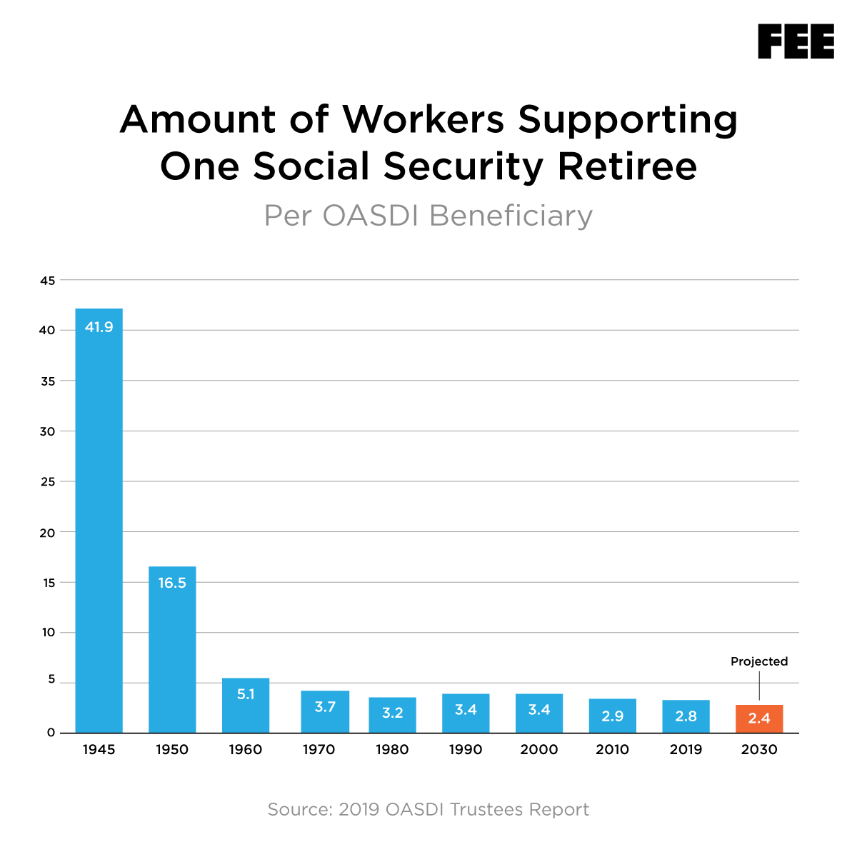 One of the problems with Social Security is that as the program has aged, fewer and fewer workers are supporting more and more retirees. In 1945, there were 42 workers per beneficiary. By 1960, there were just over five workers per beneficiary. From 1970 through the 2000s, there were between three and four workers for every retiree.