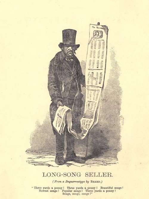 It was just as natural for news in the 19th century to be reported in song form as it had been in the 16th century, despite widespread literacy and the rise of newspapers. By this point, songs were being sold in bulk, in long strips of broadside featuring a collection of songs on a variety of topics. The ‘long-song seller’ (see image below) was a regular feature of street life in 19th-century London, selling his wares by length, rather than content: ‘Beautiful songs! Newest songs! Popular songs! Three yards a penny!’