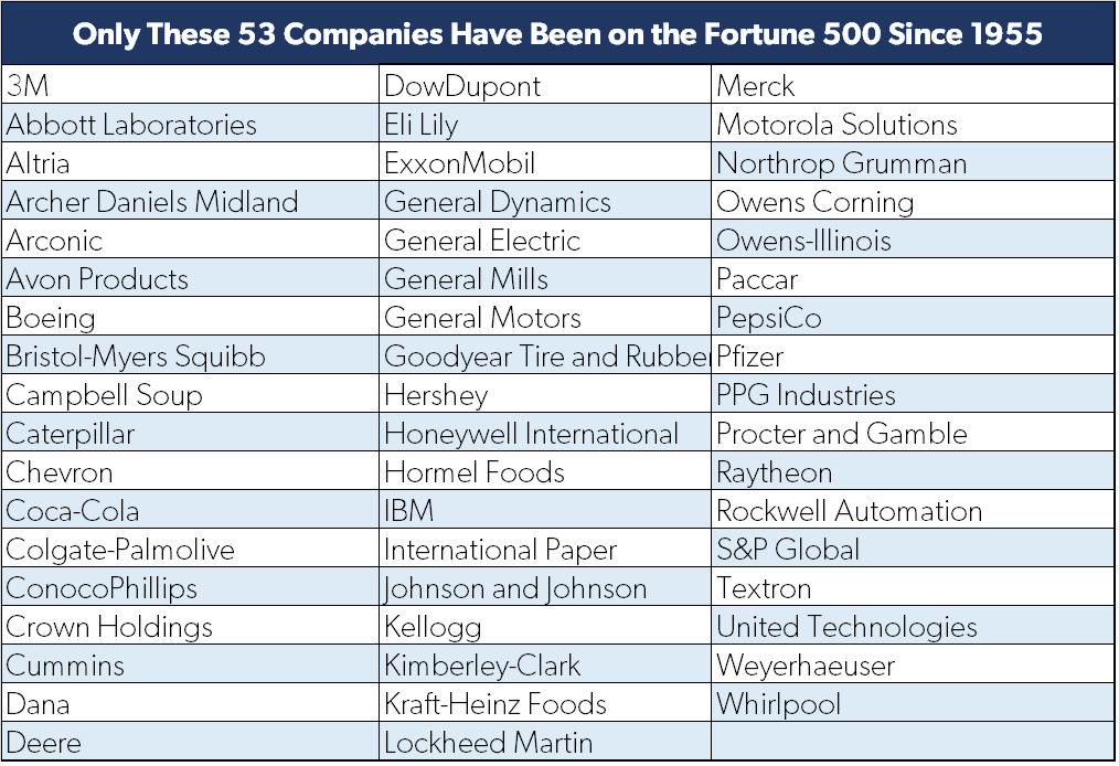 The list of Fortune 500 companies in 1955 is available here and for 2018 here (based on sales for the fiscal year ended on or before Jan. 31, 2018). Comparing the 1955 Fortune 500 companies to the 2018 Fortune 500, there are only 53 companies that appear in both lists and have remained on the list since it started (see graphic above). In other words, fewer than 11 percent of the Fortune 500 companies in 1955 have remained on the list during the 63 years since. More than 89 percent of the companies from 1955 have either gone bankrupt, merged with (or were acquired by) another firm, or they still exist but have fallen from the top Fortune 500 companies (ranked by total revenues) for one year or more.