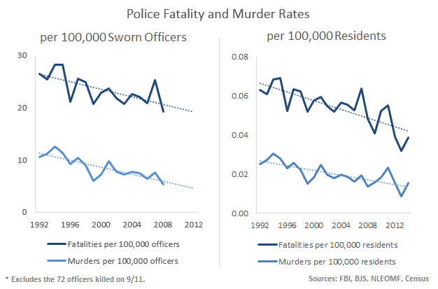 Law enforcement fatalities and murders relative to the size of the total police force are also on the decline, based on the FBI’s Uniform Crime Reports, which track the number of felony killings of police each year, and the Bureau of Justice Statistics’ census of state and local law enforcement. Between 1992 and 2008 (the last year for which BJS numbers are available), police fatalities per 100,000 full-time sworn officers fell by over 27 percent, while homicides per 100,000 fell by 49 percent.