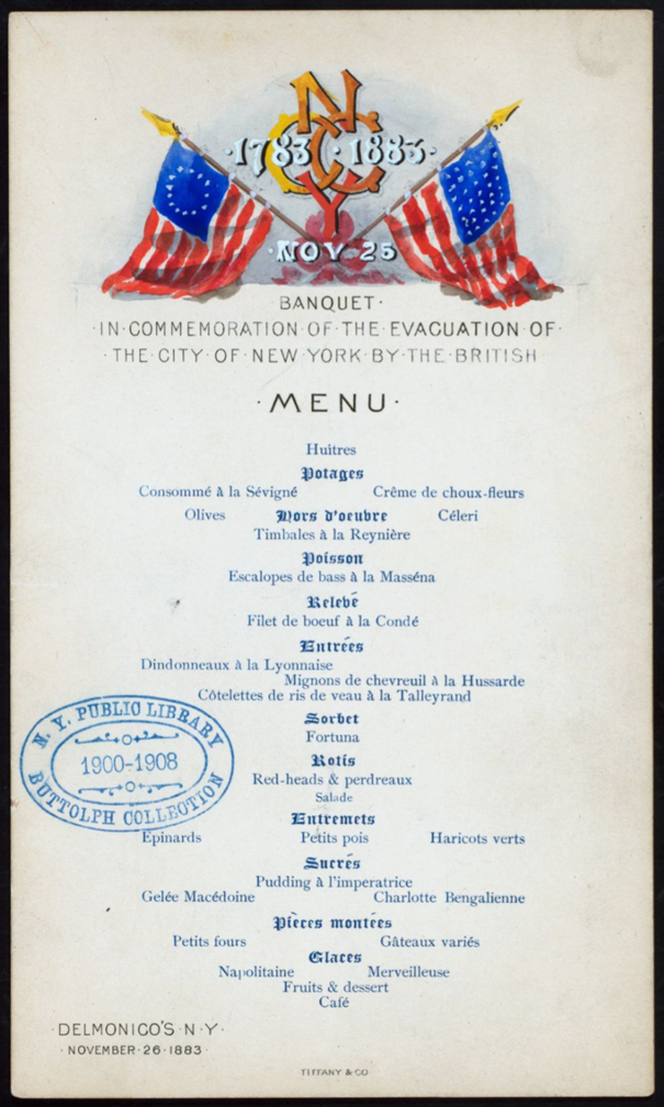 The New York Public Library holds a menu from a banquet held at Delmonico’s in 1883, for the centennial of the evacuation. Diners celebrated with courses of fish, beef and turkey, pheasant, and multiple desserts.