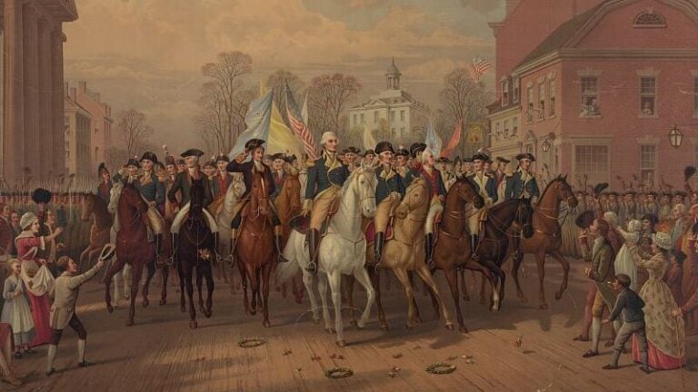 It’s November 25. If you’d been living in New York more than a century ago, you might have known this day as a holiday. Commemorating the end of the War of Independence, it marked the day British forces evacuated New York City, following the formal cessation of the conflict with the Treaty of Paris in 1783. After the British troops left, George Washington led the triumphant Continental Army through the city from north to south. Evacuation Day, as it came to be known, was celebrated annually with fancy dinners and events through the 19th century. There were fireworks, parades, and children had a holiday from school.