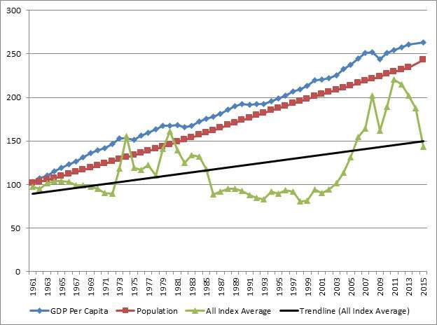 Five indexes rose in price between 1960 and 2015. However, only two indexes, energy and precious metals, increased more than income, appreciating 451 percent and 402 percent respectively. Three indexes increased less than income. They included “other” food (7 percent), timber (7 percent) and fertilizers (38 percent).