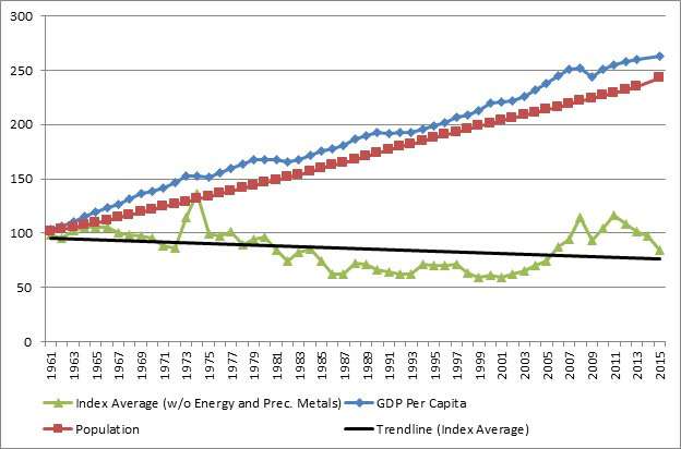 Last week, the World Bank updated its commodity database, which tracks the price of commodities going back to 1960. Over the last 55 years, the world’s population has increased by 143 percent. Over the same time period, real average annual per capita income in the world rose by 163 percent. What happened to the price of commodities?