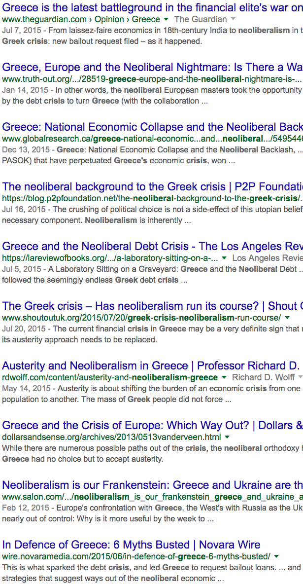 Notice that we see the usual suspects, the Guardian and Salon. Indeed all of the links on the first Google page talk about Greece from an anti-neoliberal perspective.