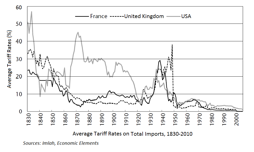 The graph below indicates these shifts in the protectionist sentiments of some of the major superpowers. As is evident, tariffs sharply reduced after the 1840s in Great Britain, while they shot up in the US after the American Civil War. As mentioned, Lincoln was a staunch advocate of protectionism and implemented a tariff of 44 percent during the war.