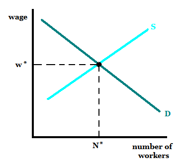 quantity of labor supplied (S) and quantity of labor demanded (D), wage (w), number of workers (N)