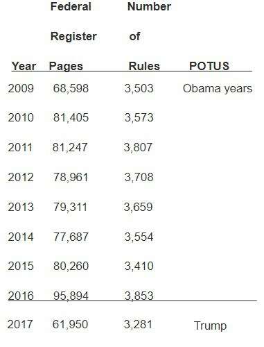 The calendar year concluded with 61,950 pages in the Federal Register… This is the lowest count since 1993’s 61,166 pages. …A year ago, Obama set the all-time Federal Register page record with 95,894 pages. Trump’s Federal Register is a 35 percent drop from Obama’s record… After the National Archives processes all the blank pages and skips in the 2017 Federal Register, Trump’s final count will ultimately be even lower.