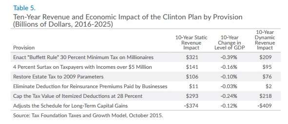 Hillary Clinton’s tax plan would reduce the economy’s size by 1 percent in the long run. The plan would lead to 0.8 percent lower wages, a 2.8 percent smaller capital stock, and 311,000 fewer full-time equivalent jobs … If we account for the economic impact of the plan, it would end up raising $191 billion over the next decade.