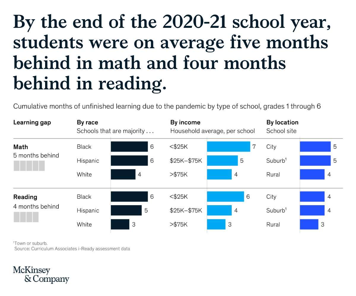 Analysts at the global consulting firm ran the numbers and concluded that the school closures will leave students an average of five months behind in math and four months behind in reading. This is bad enough, but the analysis notes that these gaps are particularly severe for students in majority-black and majority-low-income schools.