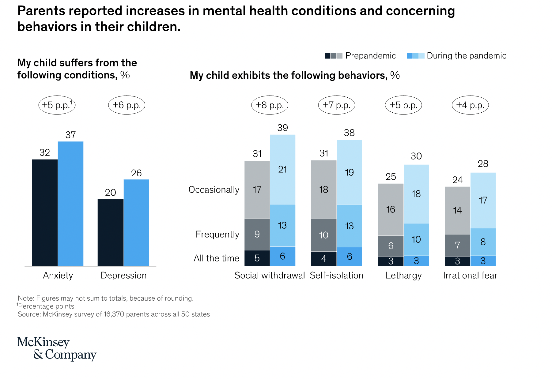 McKinsey surveyed more than 16,000 parents across all 50 states. At least 35 percent said they were “very” or “extremely” concerned about their children’s mental health. Nearly 80 percent indicated some level of concern. Meanwhile, parents reported a 6 percent increase in clinical-level anxiety and a 5 percent increase in clinical-level depression among their children. They also reported increased social withdrawal, self-isolation, lethargy, and irrational fear.