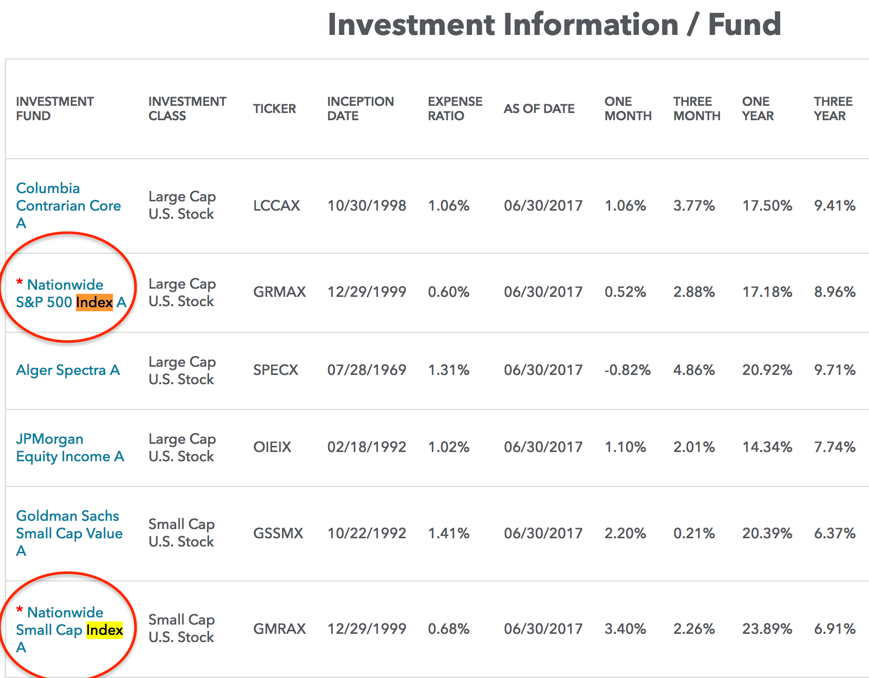 My strategy for choosing what to invest in is simple: I look for the lowest cost index fund that matches my desired portfolio. For example, my 401(k) has a “Nationwide S&P 500 Index A Large Cap” fund with an expense ratio of .6%.The equivalent ETF from Vanguard charges only 0.04%. So my 401(k)’s index fund has higher costs, but still much lower than 1.78% for some of the mutual funds my 401(k) offers. Don’t just choose funds that happened to have the highest return this year. They probably got lucky, and if they are mutual funds, the higher expenses will eventually probably lead them to underperform index funds.