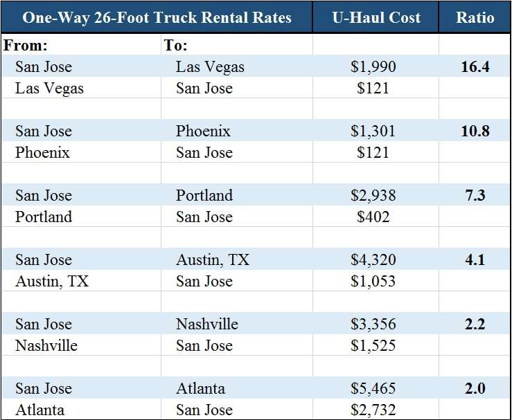The high demand for outbound U-Haul moving trucks relative to the demand for inbound trucks is being reflected in market-based one-way truck rental prices. And that’s what the price data in the table above show. For example, demand must be extremely high for outbound trucks leaving San Jose for Las Vegas, and a one-way rental for the 525-mile trip is almost $2,000. But the price for a 26-foot truck going in the opposite direction from Las Vegas to San Jose is only $121, with four days of travel allowed! In contrast, a one-way car rental from Hertz from the Las Vegas airport to the San Jose airport for four days is about $800 for a compact car and about $1,300 for a full-size car and $2,100 for a Chevy Suburban SUV!