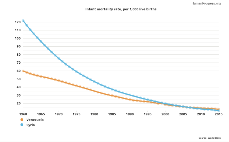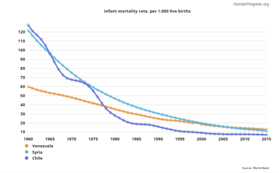 There is a lesson to be learned from these data points: economic policy matters. While Venezuela’s socialism has managed to kill more infants than a full-blown war in Syria, Chile’s incredible success story shows us that by implementing the right policies, humanity can make rapid progress and better protect the youngest, most vulnerable members of society. Today it is hard to believe that infants in Chile were once more likely to die within a year than their contemporaries in Venezuela and Syria.