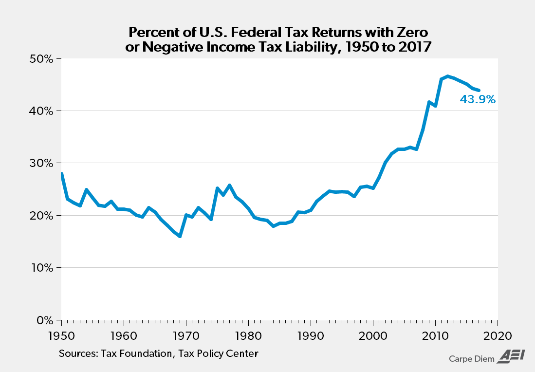 The chart below shows the annual percent of US tax filers/tax units fro 1950 to 2017 who are “nonpayers.” According to this 2012 Tax Foundation report: