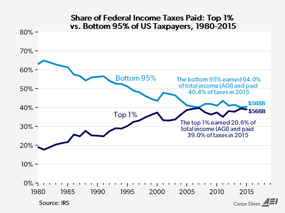 The chart above gives us another perspective on the tax burden of the top 1 percent of taxpayers over time and compares the tax share of that group to the tax burden of the bottom 95 percent in every year between 1980 and 2015 (most recent year available from the IRS). In 2015, the top 1 percent earned 20.65 percent of the total income reported to the IRS (as mentioned above) and paid more than 39 percent of all federal income taxes collected ($588 billion).