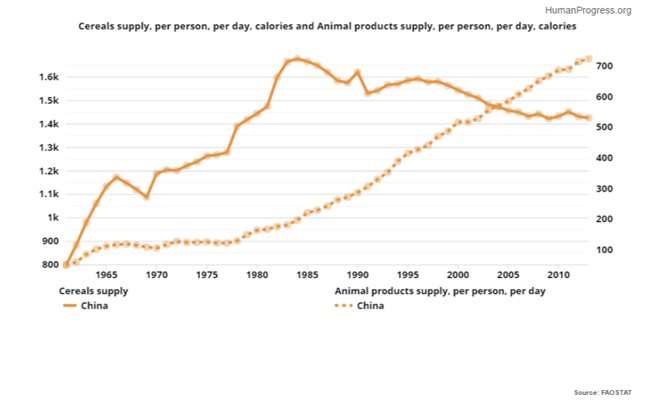 One of the interesting side effects of rising prosperity around the world has been the change in eating habits in formerly poor countries. In China, for example, people historically relied on cereals, such as rice, for nutrition. Following economic liberalization and increased living standards—Chinese income per capita adjusted for inflation and purchasing power parity rose by an astonishing 1,300 percent between 1978 and 2015—consumption of cereals decreased. Conversely, consumption of animal products skyrocketed.