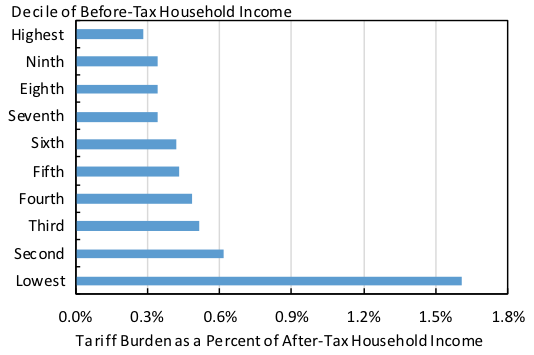 Tariffs – taxes on imported goods – likely impose a heavier burden on lower-income households, as these households generally spend more on traded goods as a share of expenditure/income and because of the higher level of tariffs placed on some key consumer goods. We estimate the tariff burden by income group and by family structure using a new dataset constructed by matching of granular data on trade and consumer spending. The findings suggest that tariffs function as a regressive tax that weighs most heavily on women and single parents.