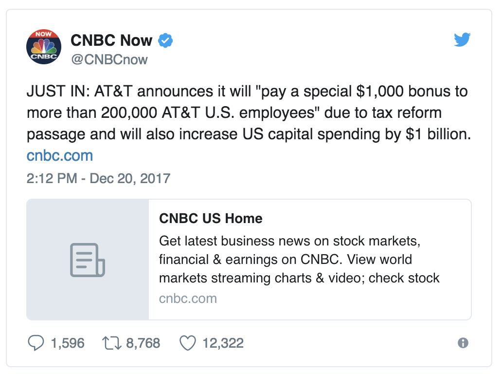 Following the House’s Wednesday vote, AT&T announced it would give a special $1,000 bonus to over 200,000 AT&T U.S. employees.