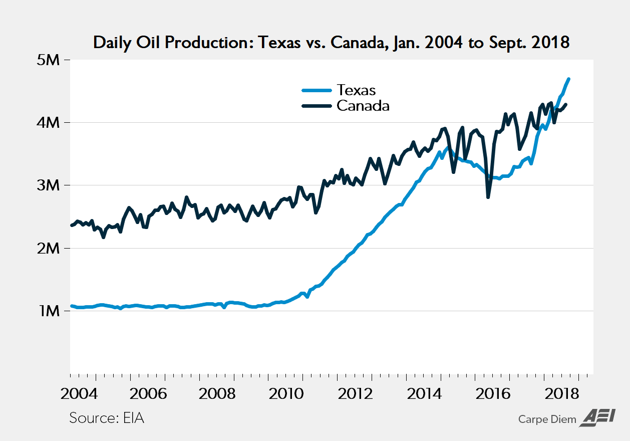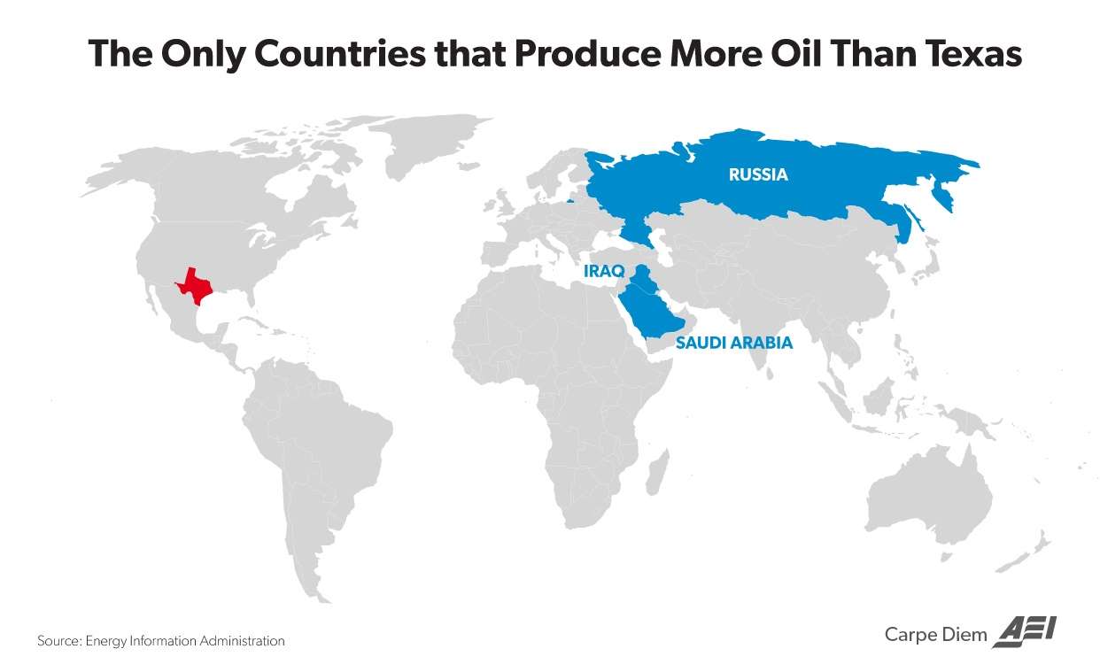 As a result of the impressive, “eye-popping,” and ongoing surges in Texas’s oil production over the last decade, the Lone Star State recently surpassed Canada’s oil output for the first time this year (except for a few previous outlier months when production in Canada dropped sharply, see chart below), and now produces more oil (4.6 million barrels per day) than all other countries except for Russia, Saudi Arabia, and Iraq (see map below).