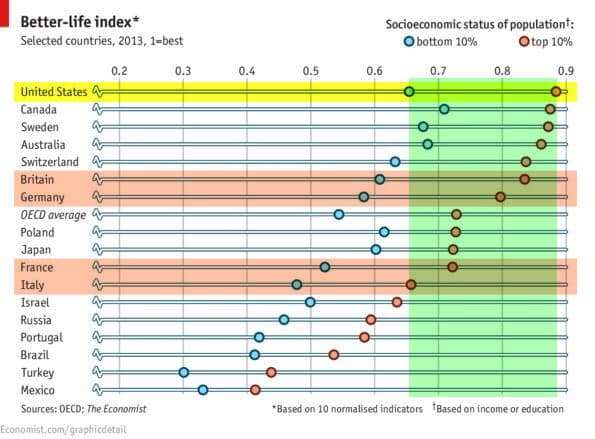 Let’s augment that analysis by looking at a graphic The Economist put together several years ago. It’s based on the OECD’s Better-Life Index, which is a bit dodgy since it includes measures such as the Paris-based bureaucracy’s utterly dishonest definition of poverty.