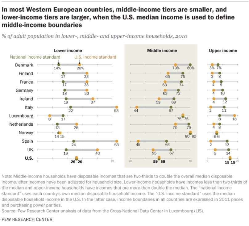 …the middle class in a country consists of adults living in households with disposable incomes ranging from two-thirds to double the country’s own median disposable household income (adjusted for household size). This definition allows middle-class incomes to vary across countries, because national incomes vary across countries. …That raises a question: What shares of adults in Western European countries have the same standard of living as the American middle class? …When the Western European countries the Center analyzed are viewed through the lens of middle-class incomes in the U.S., the share of adults who are middle class decreases in most of them. …In most Western European countries studied, applying the U.S. standard shrinks the middle-class share by about 10 percentage points… Applying U.S. incomes as the middle-class standard also boosts the estimated shares of adults who are in the lower-income tier in most Western European countries… Overall, regardless of how middle class fortunes are analyzed, the material standard of living in the U.S. is estimated to be better than in most Western European countries examined.