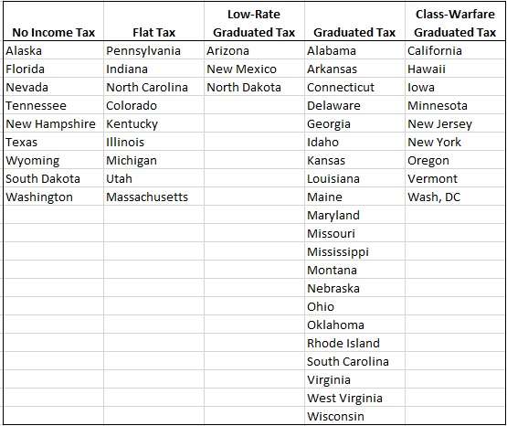 Indeed, half of the states on that unfortunate list are part of the “Class-Warfare Graduated Tax” club.