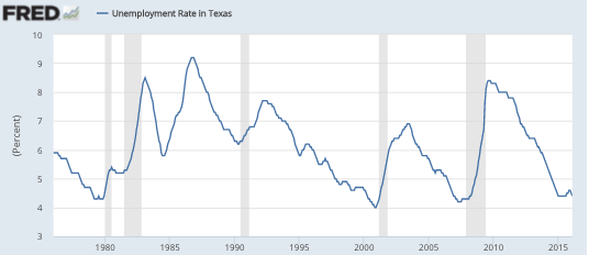 But the overall economic resilience is a far cry from the Texas recessions that followed previous oil busts. Unemployment in the state, 4.3% in May [2015], was still well below the national average of 5.5% that month.