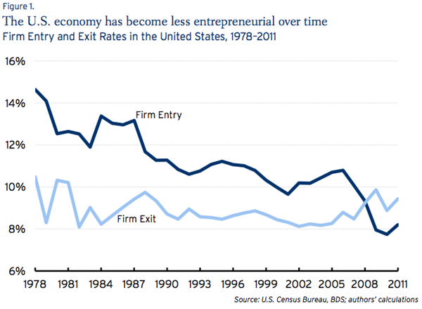Graph from a Brookings Institution paper, “Declining Business Dynamism in the United States: A Look at States and Metros” by Ian Hathaway and Robert E. Litan, http://www.brookings.edu/research/papers/2014/05/declining-business-dynamism-litan.