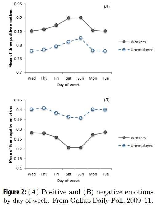 Figure 2, from their paper, shows the basic story. Workers report more positive emotions (top panel) and fewer negative emotions (bottom panel) than the unemployed but both workers and the unemployed are happier and less stressed on weekends.