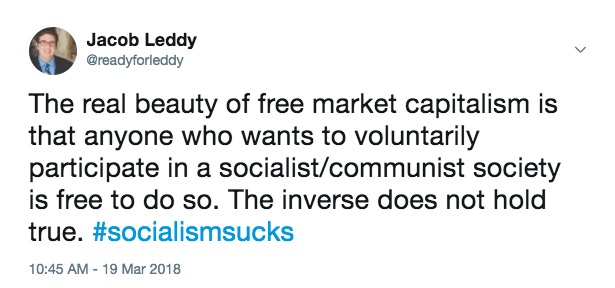 As long as it's voluntary, free-market supporters are happy to let others experiment with socialism. The opposite does not hold true.