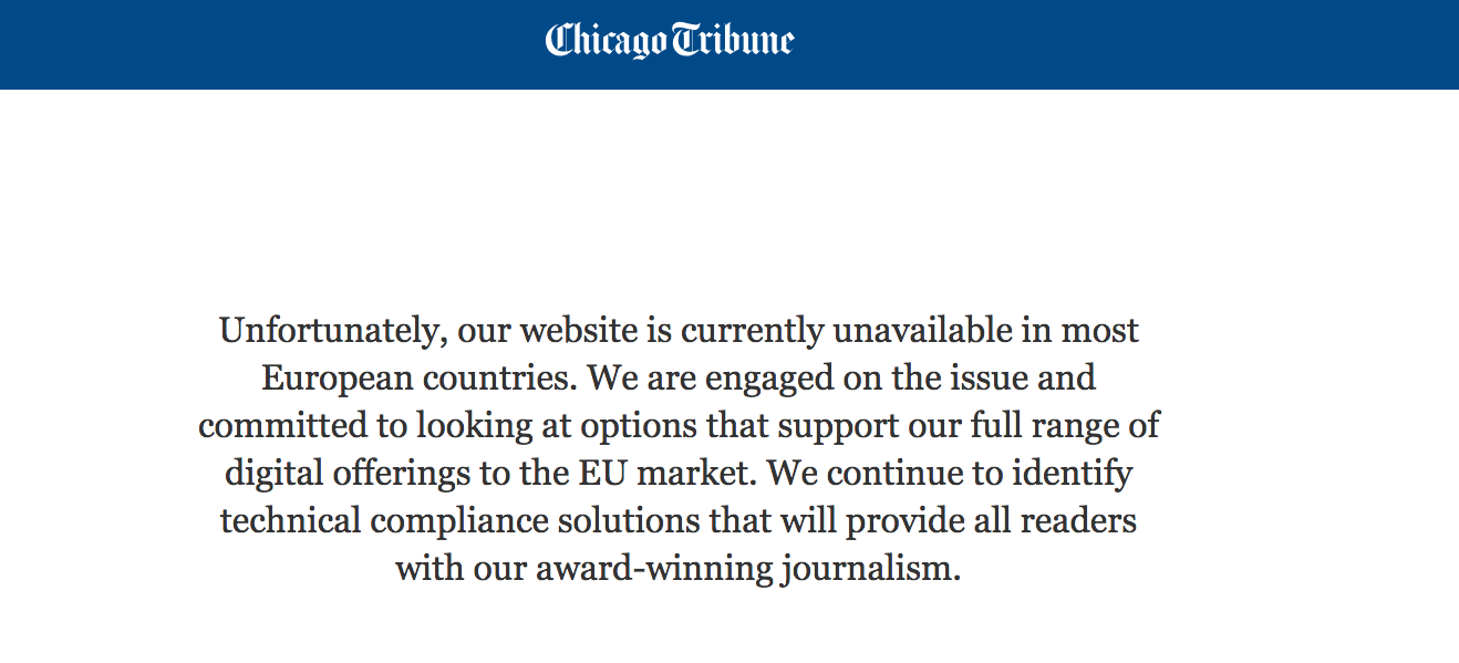 If, as a business, you can’t afford the hassle of going through with this legal gauntlet, you’ll probably just turn your back on EU users, hence culling quite a cornerstone in many markets. This has already occurred on a number of U.S. websites, who simply exclude EU users from their websites. Since I am located in Europe, this is the message I receive when I’m trying to access the website of the Chicago Tribune: