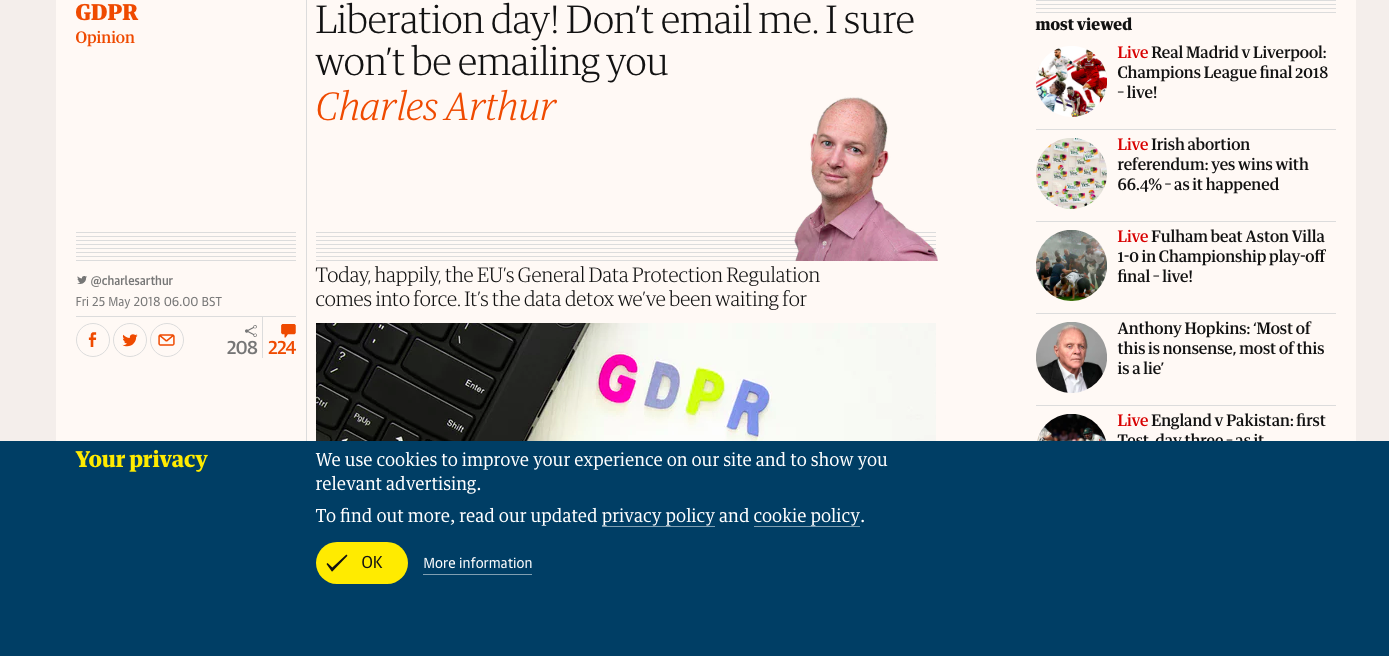 With all the unnecessary emails, warnings and blocks, what are we supposed to take away from the GDPR experience? When reading left-wing broadsheets such as The Guardian, I’m told that this is a wonderful EU crackdown on predatory business behavior. Yet strangely enough, The Guardian‘s own message telling me that it updated its own privacy policy is taking up half my reading screen. I suppose the predators are just everywhere…