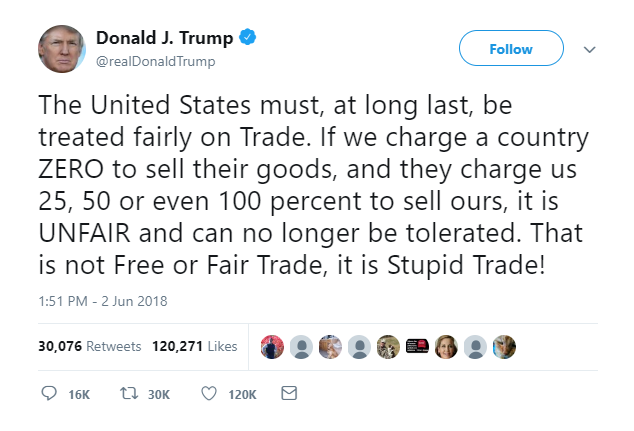 So now we will also impose import tariffs. This is basically a stupid process, the fact that we have to do this. But we have to do it. We will now impose tariffs on motorcycles, Harley Davidson, on blue jeans, Levis, on Bourbon. We can also do stupid. We also have to be this stupid.