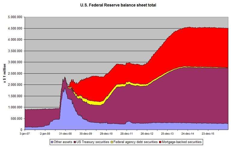 What kind of assets is the Fed investing in? As of December 2017, just over half (54.69 percent) consists of U.S. Treasury securities. Mortgage-backed securities make up another sizeable chunk (39.42 percent). Together, these two categories count for 94.11 percent of the Fed’s asset holdings – not exactly healthy ingredients for a weakened economy.