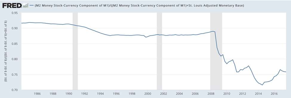 Unfortunately, this ratio has declined rapidly in the United States since 2008Q4, when the Fed began expanding its balance sheet. For the decade prior, financial depth in the US averaged around 87.89 percent. Since 2008Q4, it has averaged just 76.24 percent. Although there are many factors contributing to this decline, the Fed’s policy of paying member banks interest on excess reserves is perhaps the chief culprit. Simply put: the Fed encouraged banks to hoard excess reserves rather than make loans. This has allowed the Fed to maintain its bloated balance sheet so that it can allocate credit to favored sectors of the economy without unleashing the bottled up genie of inflation.