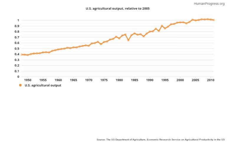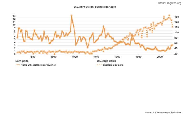 Finally, consider agricultural productivity in the global context. As Professor Jesse H. Ausubel of the Rockefeller University writes, “agriculture has always been the greatest destroyer of nature, stripping and despoiling it, and reducing acreage left.” Thus, if humanity can further increase crop yields – since 1940, the American farmers have quintupled corn production while using the same or even less land – some of the agricultural land could be returned to nature.