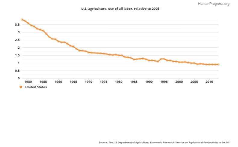 Chances are, fully autonomous robots will complete the process of mechanization of American farming in our lifetime. Already, less than 2 percent of the American labor force works in agriculture – many as tractor and truck drivers, not manual laborers. This tiny fraction of American workforce produces enough food to feed not only the United States, but also, through American food exports, much of the rest of the world.